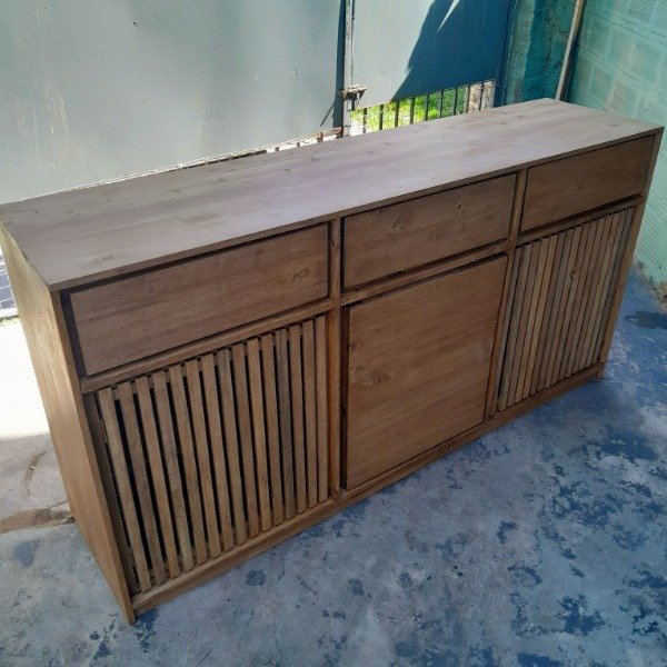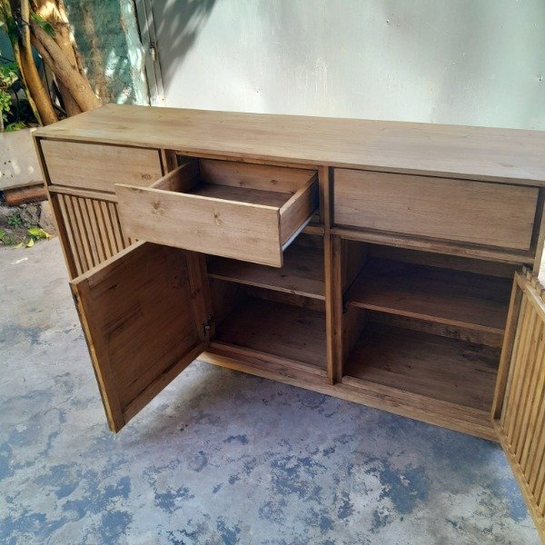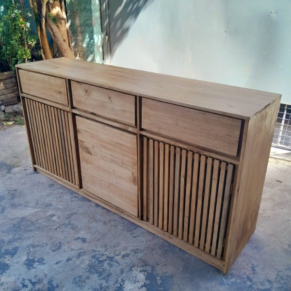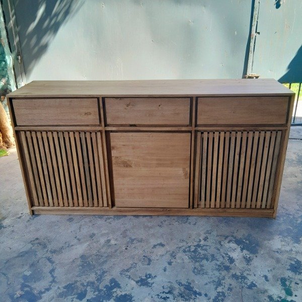 Realizado en madera maciza de álamo, cajones con correderas metálicas y terminación en hidrolaca.